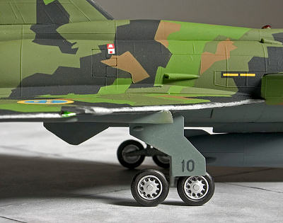 The undercarriage was painted next. I used flat aluminium for the struts, and Metalizer aluminium for the wheel hubs. The wheels got a light wash of grey pastels to bring out some detail. The undercarriage was attached and the canopy masking removed.