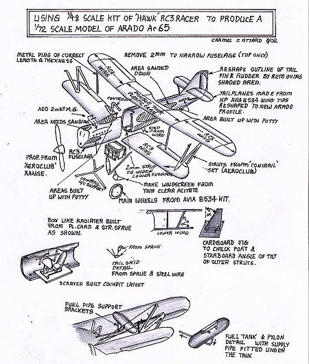 Looking through my scrap box, I soon recalled that I had a kit, which was discarded long ago, being 1/48th scale kit which it did not quite fit my range of 1/72 scale collection. This was the Hawk kit of the RC3 Racer. The only resemblance between these two aircraft was that their outline, particularly the engine configuration bore a fairly close resemblance. The broken up kit of the RC3 was retrieved from the junk box and a close comparison and study with a 1/72-scale plan of the Arado 65 indicated that the discarded model would surprisingly provide the basis for my second Arado 65.