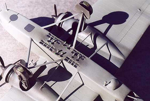 4 The upper and lower engine nacelles mounted on wing surfaces were made by carving out of balsa wood to produce the final shape shown in attached photos. This is a slow process and frequent checking with scale plans was a necessity to arrive to the desired correct shape. The surface of the balsa was sealed with sanding sealer made by mixing small quantity of talcum powder with Humbrol dope. This brought an excellent surface finish upon further sanding not unlike that of plastic.