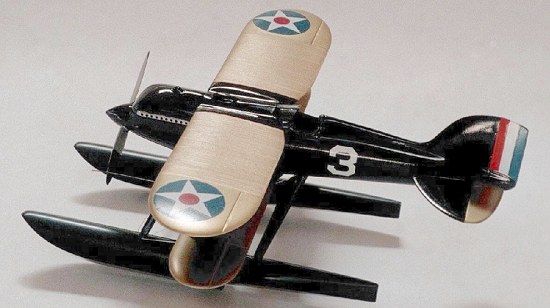 Cockpit: based on what they provided, Testors must have felt that Doolittle spent the race sitting on a bench seat made from a 2x10, with his hands in his lap! There are no controls or instruments. I felt he deserved a bit better, so I put in a control stick, and scratchbuilt a seat and headrest. I made seat belts with strips of masking tape and buckles with artful blobs of silver paint. I added a tiny instrument panel, brown with black paint circles. Nothing fancy, but a vast improvement over looking into the cockpit and seeing the tab of the lower wing poking up through the slot in the bottom of the fuselage. Given a working stick, Doolittle probably could have flown the plane. (There is a great cockpit photo of the R3C-1 in “The Speed Seekers” listed below.)