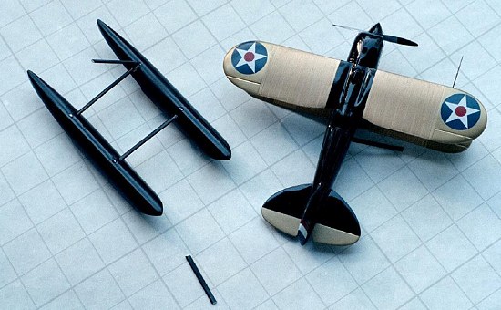 I sanded the rough finish on the floats smooth, then re-shot them with gloss black enamel. With only one set of tops and bottoms to deal with and better access, the paint leveled nicely this time. If I were to build the model again, I would paint the float/strut and fuselage/wings assemblies separately and join them post-paint.