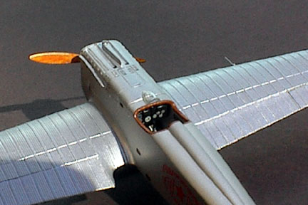 The fuselage was painted SF silver, which is already a smooth finish paint and requires no clear gloss for decals. The main fuselage was masked and the upper cowling was painted Polly Scale Bright Silver as were the wings, rudder, horizontal tails and landing gear struts and axle fairing. The model includes a main wing spar onto which the cockpit fits, so that the wings may be left off until final assembly and painted separately, very nice.