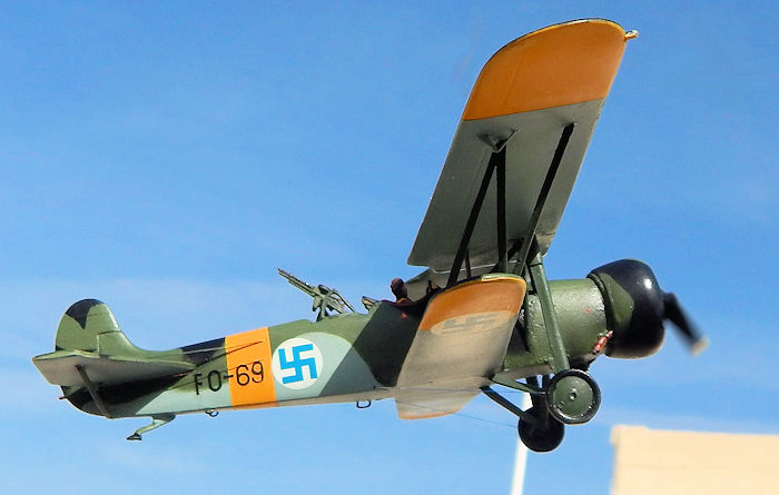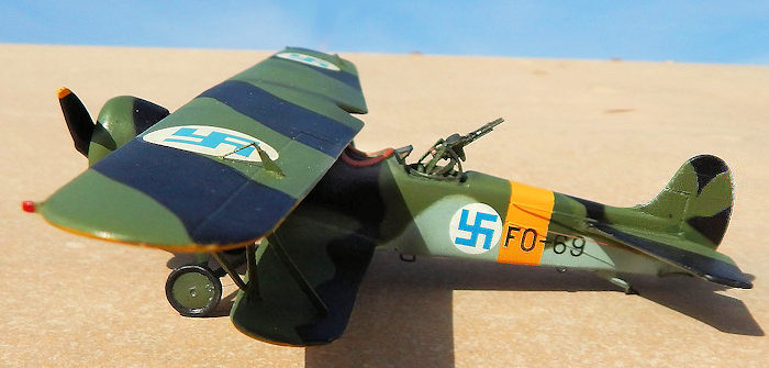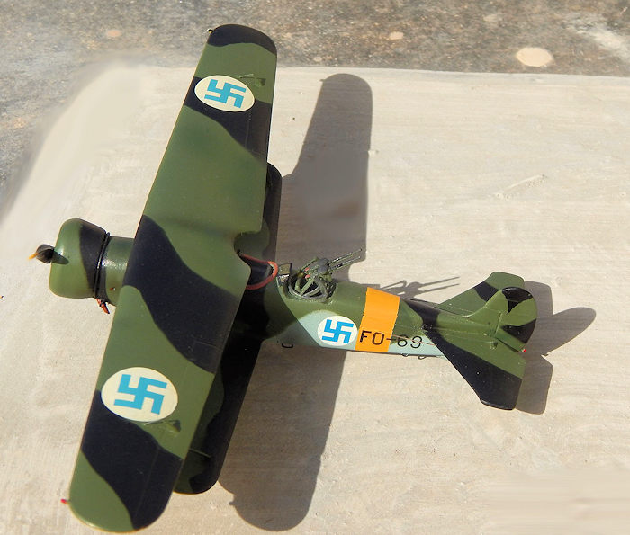 One may paint the model before the upper wing is fixed in place and that can simplify matters in most cases. I followed the kit painting plans to airbrush the model in medium green and black camouflage on the upper surfaces and light blue to lower surfaces. Decals were picked from my spares box. Model was finally given a coat of varnish to give it an overall sheen finish.