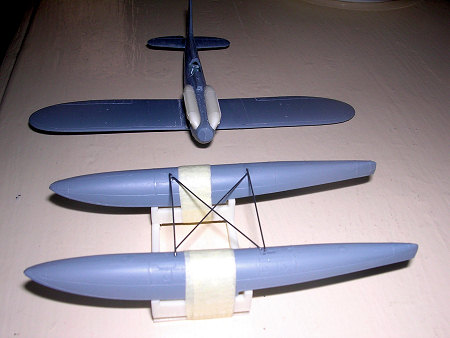 The engine manifold is in resin and very carefully produced so that it has an edge over previous S6B produced by other manufacturers. There are alternate propeller pieces to choose from. This is left for a final stages but it has a silver front and matt black rear. A make logo decal item is also provided to fit to front of blades. Alternative rudder parts are supplied so that one version will contain a trim tab. Detailed floats are also fitted together. Once these have set, I placed these to rest on the beaching trolley. The float struts were then carefully glued in place so that the fuselage rests on them and checked from front elevation to ensure these are correctly aligned. Having gone through this stage it was turn to add bracing wire. The instruction sheet implies that the bracing wire is made from stretch sprue but I preferred to use thin steel wire cut to correct lengths and glued in place. There were 16 of these having a variety of lengths. The balance weights for control surfaces were finally added. These are fragile and care required in keeping these in one whole piece.