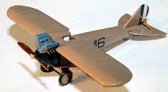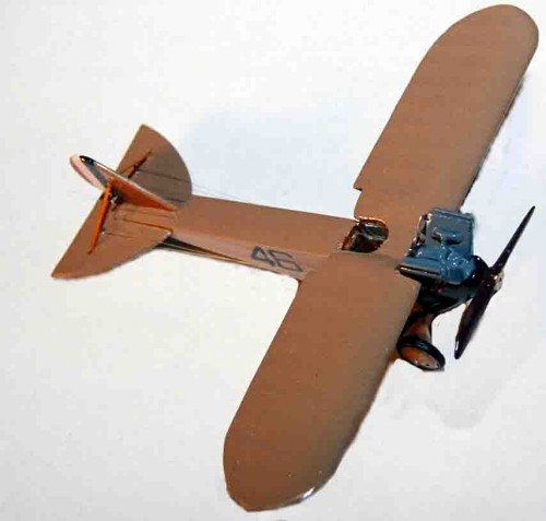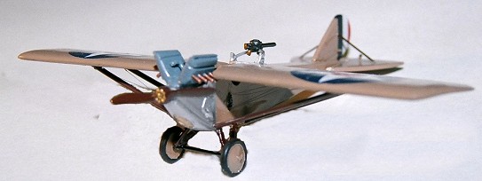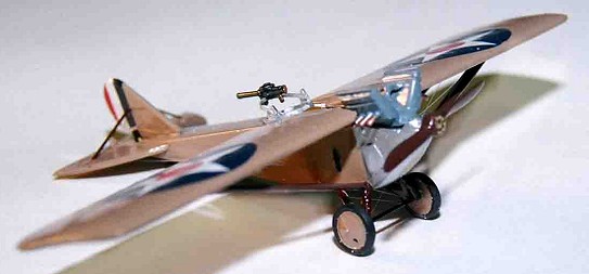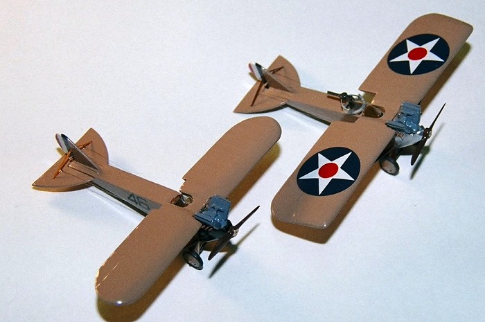 After engines, wheels, and seats were added, the projects came to conclusion with stretching of monofilament thread as control and rigging cables. Silver wire would be a better choice, but I can’t find any in a fine enough gauge. For the fighter, a Scarf ring mount had to be scratch built. References reported that it was armed with a pair of Lewis guns. I could locate only one in the spares box, but a later discovered photo (on the Web, or course) showed just such a configuration. One last part posed a problem – the radiator coolant reservoir cans.