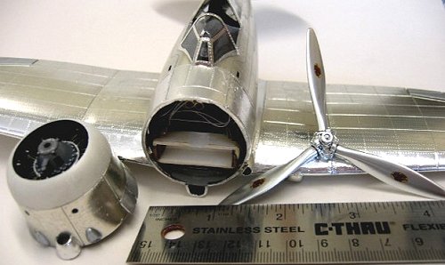 Now things start to get busy. The general layout of the HUGE raised panel lines was inaccurate. The entire model was sanded smooth and polished to a shine. Note from before, this must be done before any assembly as the parts will be handled very roughly! The fuse halves, wing panels, and tail surfaces were laid on my scanner and reproduced at one-to-one so I could carefully mark and layout all panel and rivet lines. Using many different photos from all possible angles I was able to map out the entire structure of the plane and derive the rivet patterns. First, panel lines were marked in soft pencil, masked with thin strips of DYMO LABEL tape, and scribed. Panel lines (and rivet lines) were not allowed to contact any edges as perfect alignment/continuation could not be guaranteed. After gluing halves, panel lines are “connected”, and rivets “continued” through seams.