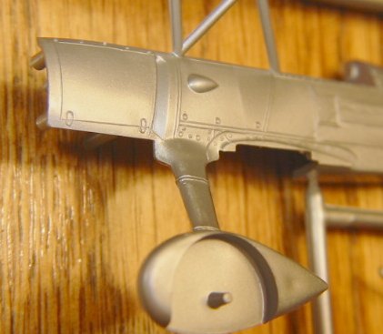 The fuselage has petite panel, rivet and fabric detail. There is no interior, except for a place to put the instrument panel decal. A pilot figure is included, but he has doesn’t even get a shelf to sit on— he has a mounting pin on his leg that goes in a socket on the inside of the fuselage. A tiny clear plastic windscreen and tubular gunsight is included.