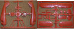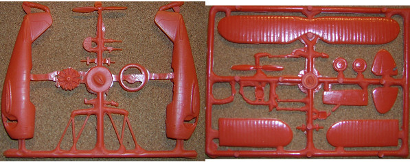 The accompanying photos show what you got for the then “luxury sedan” price of $15 - $20. Meikraft had a thing for orange plastic. Perhaps he bought out what Monogram had left over after they churned out their run of Gulfhawks and Albatrosses. At least it wasn’t as waxy and resistant to sanding as other firms’. The two sprues of the kit are very different. The one containing the fuselage is sharply defined, with petite surface detail, but a grainy texture that would be hard to remedy without loss of that detail. The wings sprue is thicker and has a shiny but undulating surface texture – like choppy water. Fixing that while preserving the scalloped ribbing would take many hours with a half round file and sandpaper wrapped dowel.