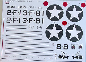 The decals are acceptable. They provide markings for the Squadron Commander’s airplane of VF-2, and for the Number 8 airplane of VF-3. The VF-3 “Felix the Cat” insignia is wrong because it does not provide white for the facial detail of Felix. Fortunately, Yellow Wings Decals is producing a sheet of decals for this kit that will allow a modeler to make any F2A-2, with the correct squadron markings. I suggest you pick that sheet up, since it will be available by the end of October.