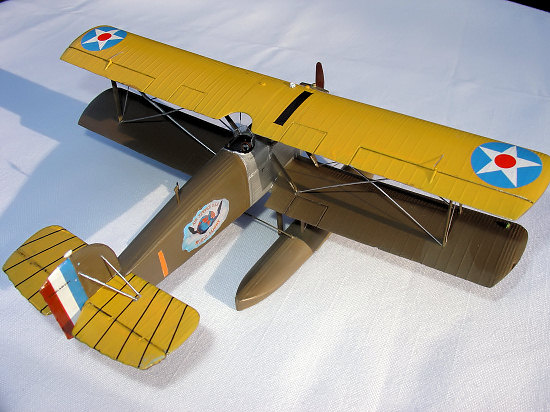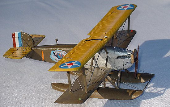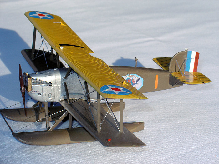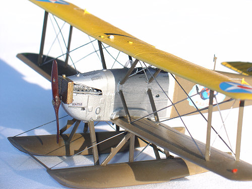 After completion, I used stretched sprue -- with varying degrees of success -- for the rigging. It was then finished off with a few coats of semi-gloss spray because the photos and museum pieces both show a nice finish existed. However, like its full scale namesake, my replica of the “Seattle” met a horrible fate -- I dropped it after bringing it out of the garage after applying its final coat and destroyed its floats, wing assembly and various rigging efforts. Once I had collected my emotions after allowing my head to spend some quality time testing the structural integrity of a wall, I remade some struts and other pieces and tried again. It is now as you see it in the photos -- but, oh, how wonderful it looked before the crash!