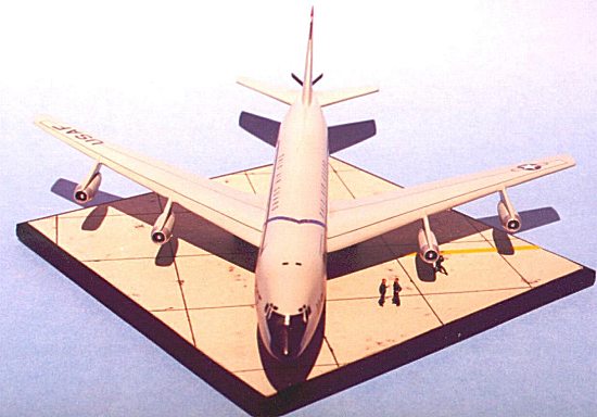 Since airplanes are flown and maintained by people, I include crew figures in my displays whenever possible. The three figures I used are from Preiser’s well detailed but hard-to-find 1/144 German/NATO pilot and ground crew set. The concrete surface that my Stratotanker sits on is cut from the back of a model box lid, suitably decked out with inked tar lines and spotted with drybrushed "oil stains."