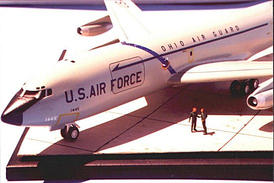 The kit markings represent an Ohio Air National Guard KC-135A of early 80s vintage. Based on my research, I decided to paint the aircraft overall Testors Model Master (MM) Aircraft Gray lightened with about 20 percent MM Insignia White. The gear wells, landing gear and interior gear door surfaces were painted flat white, then given a coat of Future. To tone down the too-glossy look of the paint job, I gave the model a couple airbrushed coats of MM Semi-Gloss.