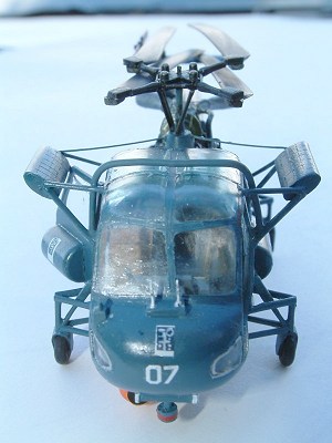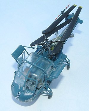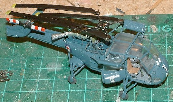 The rear rotor went AWOL, a common problem at the moment with me, the last three models have all been missing important pieces (lost by me), so a new one was made up from thin plastic card and a length of sprue. The main rotors were given a slight weight droop and glued in the folded position. Pitch control arms were added from stretched sprue and painted matt black and the rotor assembly was put aside until the construction was complete as it is rather delicate.