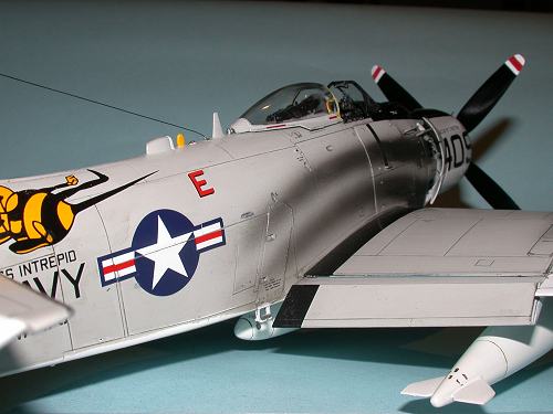 Having all the painting completed it was time to apply the decals. I had opted to use the aftermarket Cutting Edge Skyraider set that contains the VA-176 “Thunderbolts” AK409, the MiG killing Able Dog. These decals are superb and the instructions are very clear. I also used the stencil set form the same company. I would like to point out here that the kit does come with these decals and are quite comprehensive. It is only that the colours for the lightning bolt behind the bee are incorrect in the kit, being too red, that caused me to use the aftermarket stuff. Seems a little anal in the final analysis, especially as I ended up using the Yankee seat not fitted to this aircraft at the time of the shooting down of the MiG!