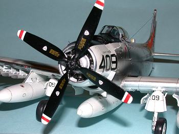 The Skyraider was extremely robust and comprised an all-metal frame. It had three airbrakes, on each side as well as a ventral one. Powered by a big two-row R-3350 cyclone engine that drove a four-blade variable pitch 13ft 6-inch propeller, giving a power output of 2,800 hp the Skyraider had a maximum speed of 322 mph at 18,000 ft (A-1H). It had an oil cooler intake located below and immediately aft of the cowling and a carburettor air intake situated on top of the engine immediately forward of the windscreen. The wings were designed to fold upwards for ease of stowage. The wheels had a single disc brake with three piston calipers (my Celica has one piston per brake, even if the discs are ventilated, and it is at least thirty years younger in design!) and were rotated through ninety degrees to the rear when retracted.
