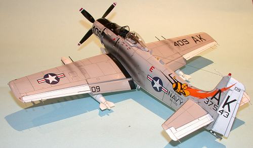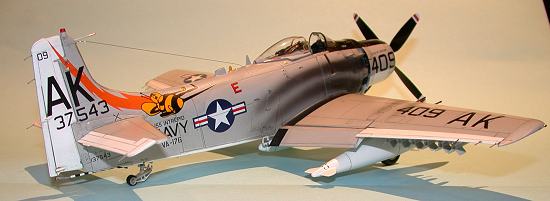 The particular aircraft I chose to depict had a variety of stores that could be carried. Tamiya present most, if not all of them and in a fairly unique manner, with the fuel tanks and the AN-M66A2 2,000 lb bombs having poly caps located internally allowing them to be removed for different posing. I had elected to use all the fuel tanks on the centerline and two inner pylons and use the 5-in (127-mm) HVAR (High Velocity Aircraft Rockets) unguided air-to-ground rockets on the Aero 14 pylons. This configuration was the state of the aircraft when it shot the MiG down, although the rockets were not successfully employed. In addition to the stores already mentioned the Skyraider also had four M3 20-mm cannons located between the inner pylon and the Aero 14 pylons on both wings. Each cannon had 200 rounds of ammunition.
