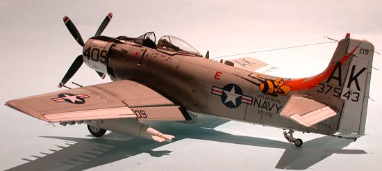 The AD-1 had a single 20-mm cannon in each wing and subsequent models had this increased to two per wing firing 200 rounds apiece. The ordinance of this amazing aircraft eventually increased to be accommodated on a total of 15 hard points. Such weapons as 500 lb napalm tanks, 2,000 lb HE bombs, 500 lb bombs, 250 lb low-drag bombs, rocket packs with 19 2.75 inch folding fin rockets, SUU-11A rocket launchers with four five inch folding fin rockets and five inch folding fin air-to-ground rockets. It could also carry three auxiliary fuel tanks, two beneath the wings and one on the underside of the fuselage. These tanks had approximately 300-gallon capacity and raised the ferry range to 3,000 miles!