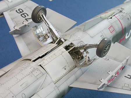 Overall, this is a fine model kit except for a few problem fitting areas such as the air intakes and the bottom fuselage pieces behind the nose gear well. Other than these areas, everything is pretty much a snap together fit (literally). Ejection pin marks are on key parts such as on all the wing leading edge, flaps, fuel tank fins, and landing gears. The other draw back to this kit are the vast amount of rivets. Recessed details to represent rivets are generally a nice touch when done around access panels and panel joints. It becomes an over kill when done excessively such as rivets all over the wings and stabilizer.