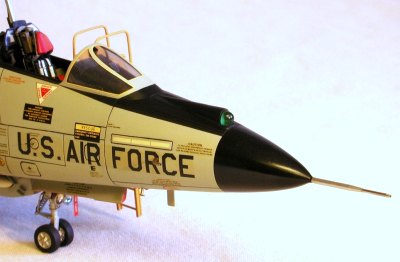 The plastic pitot tube was sawed off and replaced with a metal one fabricated from 1/16" aluminum tube and a #20 hypo needle. Needles, bent into a hockey stick shape, were also used for the AOA transducers, one on each side. A straight pin, with the head suitably re-shaped into a triangular configuration, was drafted to serve as the outside temperature probe. With the detailing complete, I attached the nose to the fuselage.