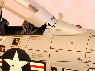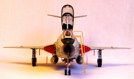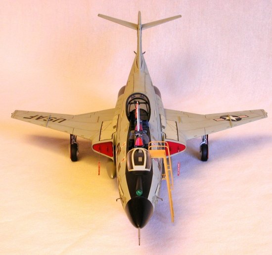 The intake covers were painted insignia red and attached with white glue. As an afterthought, I scratch-built a boarding ladder using Plastruct ‘I’ beam for the rails and Evergreen .025" rod for the rungs and grab handles. I made several ‘Remove Before Flight’ warning tags and attached them to the landing gear, arresting hook, canopy actuator, intake covers and droptank fittings with pins fabricated from light-gauge wire. After positioning the canopy onto its hinge points and actuator, I deployed the model to my display shelf.