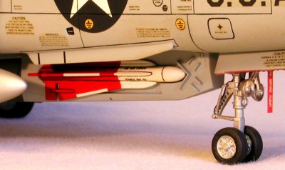 I prepared the missiles by assembling, painting, and decaling them, then installing brass wire pins to provide mounts for attachment. The missile pallet was removed and drilled to accept the mounting pins. Monogram omitted the sway braces for the door vane (part 25) so I added them with Evergreen .025" rod. The spoiler (part 15) looked correct and was attached after making some adjustments to its mounting tab.