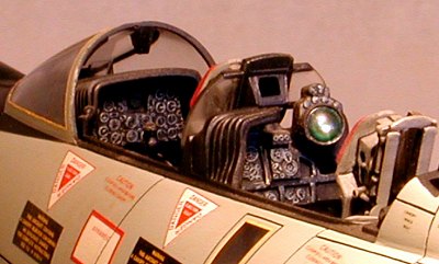 The afterburner cooling scoops needed a little TLC, so prior to installation, I drilled out the fronts and squared up the holes with a file. Massive sinkholes in the moldings required repeated fills with CA and multiple sandings to correct. When they looked like scoops, I attached them with gap-filling Hot Stuff and faired them into the lower wing with sandpaper. I cleaned up the SAGE antenna (part 96, mis-identified as a "directional antenna"), test-fitted it, then set it aside for later installation. With the wing complete, I turned next to the cockpit.