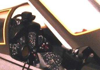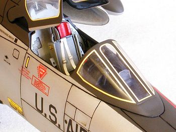 The four-piece cockpit reflects typical Monogram casting—the instrument panel and side consoles are well-depicted while the seat is oversimplified. The molded seat belts are very poor and the left console cries out for a throttle. A seated two-piece figure is provided and the canopy may be posed open or closed though fit difficulties may prove problematic with either option. The clear parts themselves are magnificent with all framing correctly molded. Three unused parts consist of an extra control column, seat, and an F-105G rear instrument panel. The sprue containing these items was also common to the Wild Weasel variant and the later F-105F release.