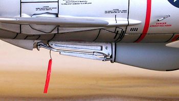 When the final coat had dried I plugged the ordnance into their respective pylons, installed the canopy, then built a set of ‘remove before flight’ tags and added them to the pylons, landing gear, and arresting hook. White glue was used to attach the AOA indicator and temperature probe, while a pair of Monogram F-100 boarding ladders were cobbled together for their new mission, providing pilot access to the Thunderchief.
