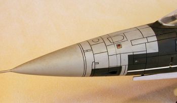 the nose and vertical fintip, afterburner cooling scoops, and the nose-mounted