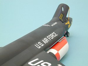 I noticed that there might be a misspelling of the word "peroxide" which the kit decals depict as "peroxyde". I don’t know if that was a mistake by the decal artist or NASA, so I left them on the lower horizontal stabilizer and hope that no one notices. After the decals were dry, I cleaned up the leftover glue residue and sprayed an overcoat of AeroMaster Acrylic Clear Flat.