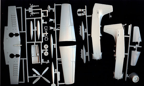 The kit should be no surprise to anyone who has seen it before. The kits has fine raised panel lines, recessed control surface outlines, no wheel wells to speak of and a bare if serviceable cockpit underneath the thick but clear canopy. A molded into the canopy engine and helpful raised paint demarcation lines on the propeller and the fuselage. The molds are in really good shape, comparing the 40 year old parts to the new ones shows the mold has held up well. The major difference is the old kit is molded in a medium gray and the new one in light gray. There is no flash to speak of, the only real problems were a bit of a sink mark on the ailerons that was more pronounced on the old kit, some kind of rash on the lower wings behind the bomb racks, round knock out marks on the elevators with just a hint of flash (not to worry as they don’t cross any detail lines) and the ubiquitous 1967 copyright mark on the bottom of one of the elevators all of which is identical on both old and new kits. Nothing a sanding stick can’t fix. There is also a fine raised line behind the cowling under the cockpit where the old kit had you paint in the black area to hide the exhaust stains. Basically they could have been pulled at the same time and the new one stored for 40 years. Things under wings are limited to a single drop tank and 2 napalm tanks. The six racks on each side is correct for a USAF bird, I think I read the Navy ones usually had fewer, maybe 4. The Hasegawa weapon set is your friend here unless you have a supply of leftovers from other kits. The canopy is thick but clear. Wasn’t much to see in the old girl anyway with the decal instrument panel. The only options I can see besides the markings are the differences in the 3 versions, which antennae and fairing needs to be removed for which version and removing a bump from the port landing gear cover for the Navy versions and darkening the rear canopy sections for the USAF version and 1 of the Navy ones. I think you can build it gear up, but since the neato bandito stand isn’t included in this new version...