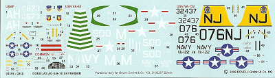 The real jewel is the decals printed by Revell in Italy. As noted by Scott, way back when there were not a lot of decals for the A-1E. Time has been of little help. Looking at Squadron and Great Models yielded only one sheet with 1 A-1E Eagle Strike 72004. I suppose you could adapt others but... This kit contains 3 separate sets of markings, an SEA camo, an all blue and a grey over white. The only beef I have is the blue in the insignia looks to light, but that’s me and on the all blue one, it doesn’t matter. The all blue Spad is illustrated in the Squadron Signal Skyraider in Action book and they seem to have gotten it quite right with all of the stencils I could see in the photo. If you look at the decal scan you can see where the green and white stripes have a cutout on both sides of the rudder, the large M fits there. In the photo the canopy seems partly trimmed in a lighter color, maybe silver but it’s right along the edge of the glass and the frames are all blue. The green flash on the cowl and the rudder looks right smart, I believe I may do this one, too. The original dash panel decal is still there, but all 3 versions appear very nicely covered including stencils, ejection seat warnings, etc. The grey and white Spad also has the curved black area down the side, modified from the original being somewhat flatter. To date I’ve not seen a photo like this, but that could just be me.