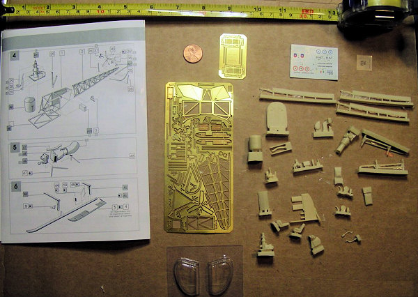 The kit is made up of 43 resin bits, 85 etched parts, the two vacuformed cockpit halves, and a tiny 1.5 inch by 2 inch decal sheet. The box is waxed paper over a stout corrugated cardboard bottom.