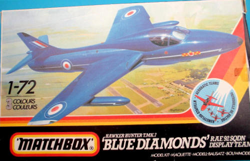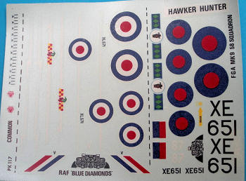 The Hawker Hunter prototype first flew on July 20, 1951, and entered RAF service in 1954. Hunters formed the backbone of RAF fighter strength up to the mid-1960s and over 400 were exported. Many Hunters remained in service in the UK and overseas well into the 1980s. The Hunter T7 two seater trainer entered RAF service in 1960. These were a combination of new aircraft and converted older F4 fighters. For the 1961/62 air display seasons, No 92 Squadron formed the RAF aerobatic team known as the ‘Blue Diamonds’. Though operating mainly the Hunter F6s, the team also had at least one T7 which often took part in the displays. The Hunter FGA 9 was an improved ground attack version of the F6, eventually serving with nine RAF squadrons with 92 being one of the last two. (Thanks to the kit instruction sheet.)