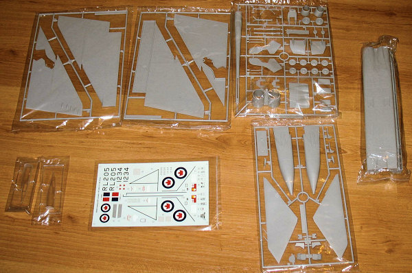 The kit consists of two sprues of grey plastic (64 parts) and two canopies (one spare) plus the decal sheet.