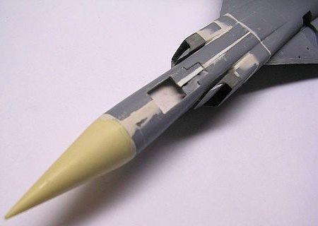 Using a series of Pavla Models resin sets normally intended for the Trumpeter kit this incorporates additional work but in the end a much more desirable Su-15 interceptor will result. Nose weight is always needed even though the nose cone is to be replaced with a solid resin nose. The lead weight is inserted at a compartment just behind the cockpit.