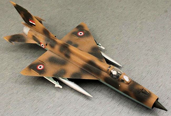 I painted the Nesher at the same time as this MiG. To get them looking distinctly different, I selected three different shades of brown – the lightest and the darkest for the Nesher, and the middle one (Tamiya XF?? ) for the base coat of the MiG. This was sprayed on, and was to be followed by a cam of (Tamiya XF??) dark green blotches. Note – I stink at doing mottled cam.