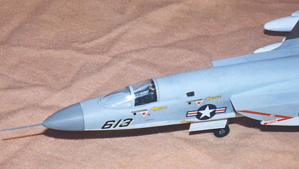 After the painting was done, I decided to 'dirty it up a bit' and applied several washes of Pro Modeler Gunship Grey after I put on a coat or two of Dulcoat. The wash worked okay except for just above the left Stabilator. When I was washing the underside, some wash seeped between the fuselage and Stabilator and 'dripped UP' the fuselage, and I was unable to get it cleaned off. A set of Super Scale decals was obtained from B & J Hobby over the internet, and I opted to do an aircraft from RVAH-5 (The Savage Sons) located at Key West, Florida, in the summer of 1977 (ser# 156620/GK-613). Interestingly enough, on Scotty's website is a Reference photo of another RA-5C from RVAH-5. In Scott's review, he mentioned breaking off the fuel-dump part near the tailcone several times so I saved that for last. I also made my own pitot tube out of stretched 'glass' styrene sprue. 'Glass' holds a straighter point than regular sprue. I tried Future floor polish for the first time on the canopy and was really happy with the result...don't know why I'd declined to use the stuff over the last couple of years.