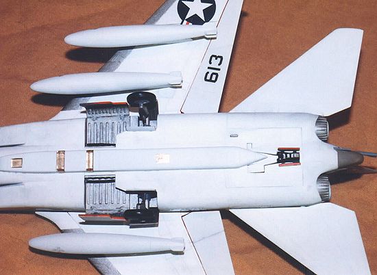 Since I 'dropped the hook', it only seemed natural to 'drop the flaps', so I cut those out with an X-acto saw blade and made some 'hinges' out of stretched sprue. Painting the inside edges of the flaps flat red adds some nice color to break-up the 'grey-ness' of the paint scheme (Model Master Flat Gull Grey over Testors Flat White). The gear door edges got the same treatment. Go ahead and remove the locating pins from the drop tanks, as they totally mess-up alignment of the two tank halves. I was THIS close to making one of those "What If..." models and hanging a bunch of Mk. 82 Snake Eyes and T.V. Glide bombs instead of the fuel tanks but sanity prevailed and I stuck with the tanks (it would've looked pretty cool though, and I'd wager Five dollars that Viet Nam RA-5C pilots wanted to do the same thing).
