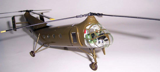 Assuming the engine bay doors are to be displayed closed, a better building sequence, however, might be to first affix them to the fuselage halves. These large panels fit very poorly, leave large gaps and are impossible to align flush with the exterior surfaces. Much putty, sanding , and re-scribing here, Folks. A minor “accurizing” job consisted of sanding away the too-short door-slide rails and making new ones of strip stock. Adding tail fins and the rotor hub buttons moved the airframe to the paint shop.