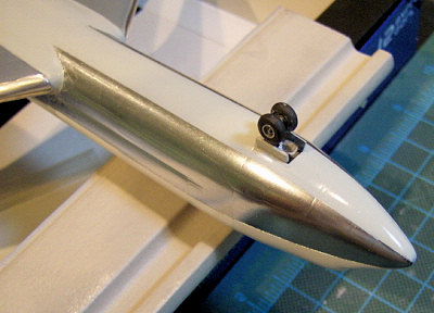Next, the clear cockpit window/roof section was attached with thick super glue, and then sanded after first covering the windshield frame lines with masking tape to preserve the scribed surface detail.