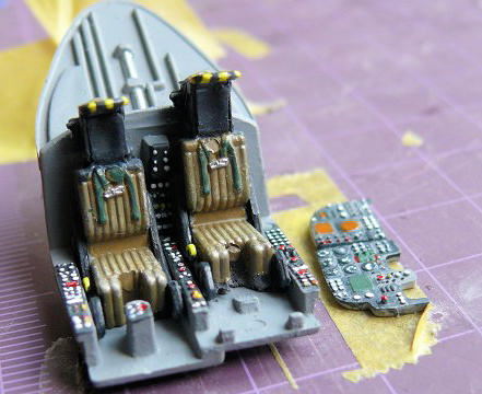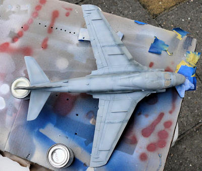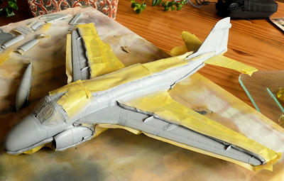 After a month of disinterest, I practised my painting with an old Revell Corsair II -with help and motivation from the MM Forums that came out very nice. Intruder interest was back at once! I filled and sanded some more, assembled and sanded the droptank and shot everything again with primer. That's better, time for the paint shop.