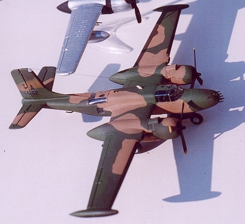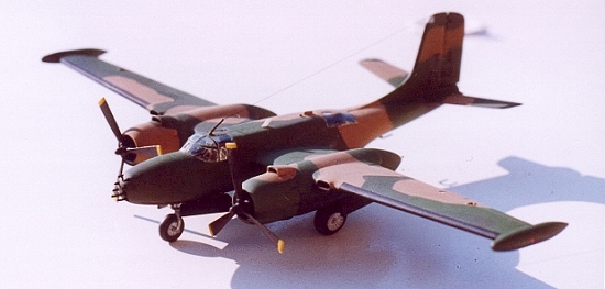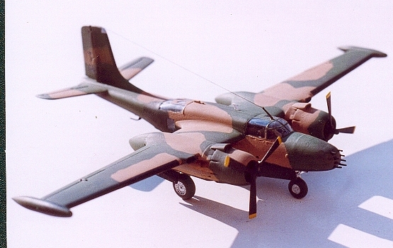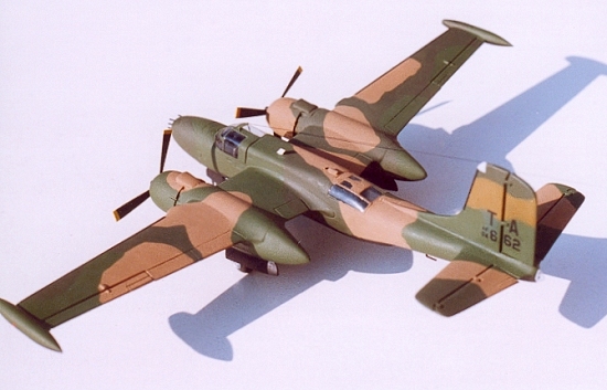 Re-manufacture was carried out by On-Mark Engineering, and consisted of re-building the cockpit with full dual controls and new avionics. The fuselage was re-built without turrets, and a larger rudder was fitted. Wings had 8 underwing hardpoints, and wingtip fuel tanks added. Original engines were replaced with more powerful ones fitted with fully reversible propellers. A full 3 tone camouflage over black undersides was used in Vietnam.