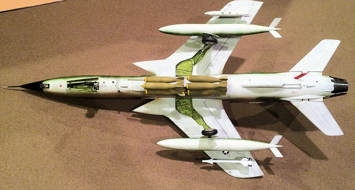 The internal weapon bay is now assembled. It’s ironic. F-105 primary mission was to carry a nuke in this bay, then fly hard and fast down in the weeds and deliver it to the target………….But spent most of the life carrying an extra 550 gallon fuel tank inside, never to be opened while lugging six 750lbs conventional bombs on the outside to deliver them from medium altitude! You can open up the bay doors but I chose not to since this bay was never opened during the F-105 Vietnam combat life except during maintenance. I did put in some nails in them, taped up to secure them since this aircraft is quite tail heavy when done. In fact, before the fuselage was closed up, I also insert plenty nails into the nose for this fact.