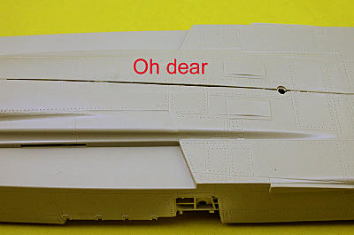 Kit engineering -- Besides not providing any intake trunking or even blanking plates, Trumpeter chose to mold the fuselage pieces in left and right halves, a serious mistake in terms of structural integrity. With the Vigilante being such a wide and flat airplane, there simply is nothing to prevent serious flexing of the top and bottom of the fuselage. Instead, they should have made a top and bottom rear fuselage section and a separate left/right front nose section to be mated to the back, designed like just about every F-14 and F-15 model kit. Nautilus Models makes a wooden internal bracing structure that can be used to beef up the kit structure. It works fairly well, but a modeler can also provide their own bracing using cut pieces of sprue and sheet styrene along the join line to provide the necessary strength.