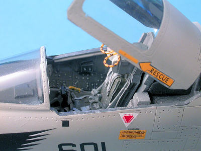 The cockpit was painted Dark Gull Gray FS36231 overall with flat black decking. The ejection seats were painted Dark Gull Gray as well with Olive Drab cushions, Medium Gray harnesses, and an off white headrest. Ejection face curtain loops were made from wire and painted yellow with striping applied with a fine point black Sharpie marker.
