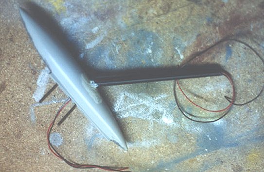 In order to make a model LOOK like it’s taking off, it has to be OFF the ground!!!!!!!!!!! DUH………….to TRY to capture this feeling, I used a piece of broom handle, drilled holes in it, epoxied some thick copper wire in the holes and then hot stuffed and epoxied this thing to a cradle that was welded to a piece of steel tubing. I epoxied and hotstuffed the kit drop tank to this THING. I even had the foresight to make sure that I used hollow tubing and didn’t fill the hole for the wires with epoxy. I think I get a gold star for thinking ahead!!!!!!!!!!!!! I’ve actually had the model mounted to the mount/drop tank and it works!!!!!!!!!!!