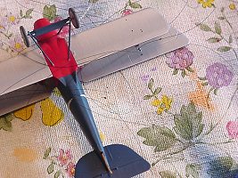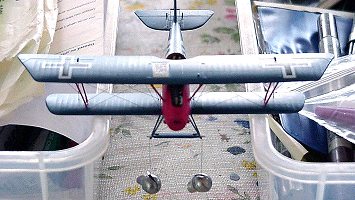 As you can see from the pictures, I super glue the rigging to the upper wing and thread it through the bottom wing. I use fishing weights (the clamp on variety) to tension the lines and use a drop of glue to fix the line in place. After a second you can cut and make the line flush with the wing. Now a little touch up paint and the under wing decals and viola, you have an aesthetically pleasing configuration of rigging lines.