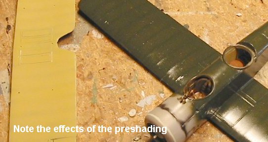 I first "pre-shaded" the model, airbrushing flat black over all the ribs and airframe structure.