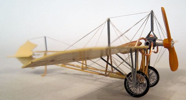 Make a fuel tank from sprue sanded into two conical sections. Paint it copper. Make a conical forward propeller support from sanded sprue. Get a prop from the big Bag of Props in your spares box, sand to shape, paint brown with clear orange topcoat, cement in place.